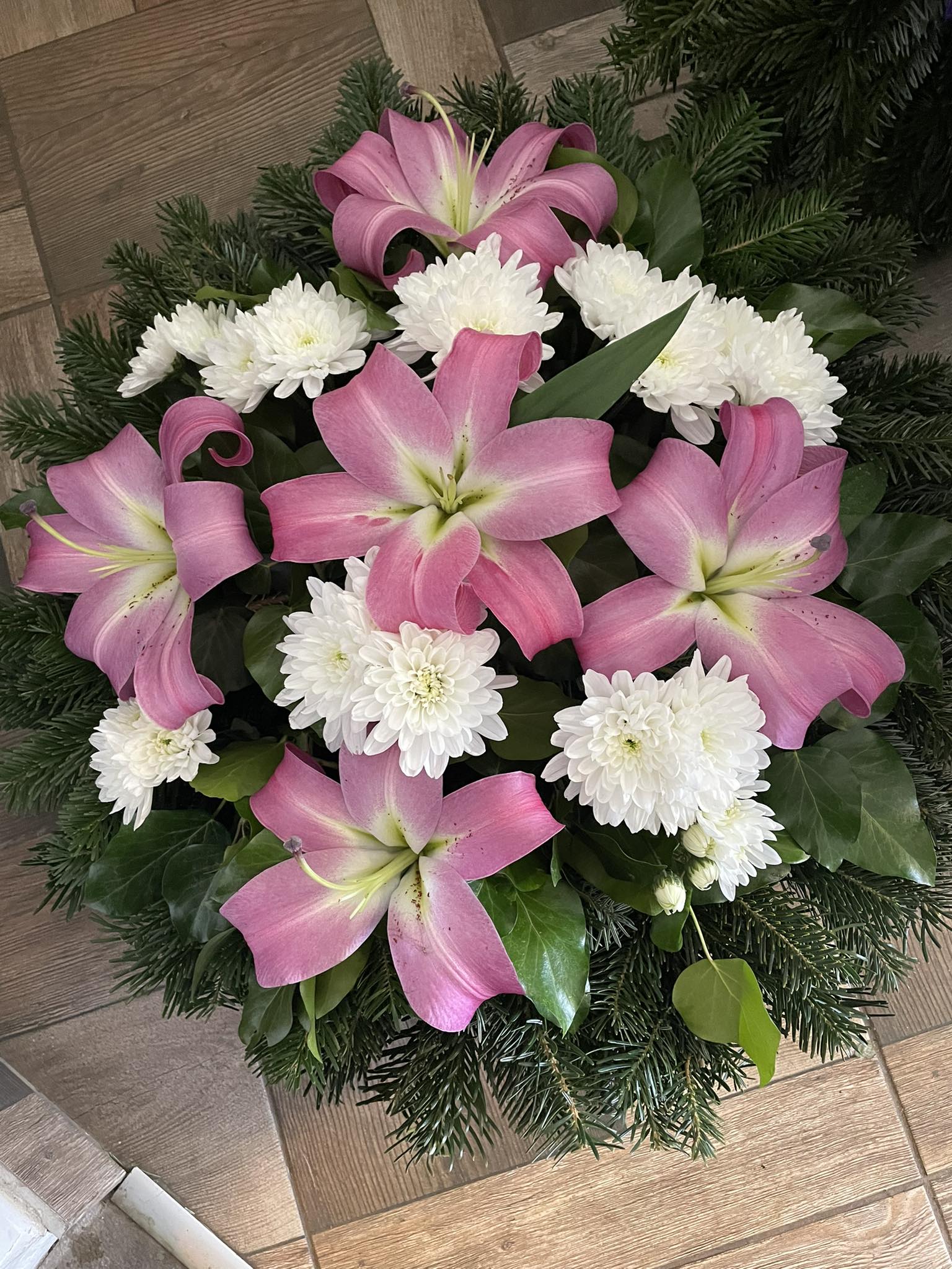 A Liliomharmónia fekvő koszorúja a rózsaszín liliomok és fehér krizantémok finom összhangját hozza létre, hogy méltóságteljesen búcsúzzunk el szeretteinktől. A liliomok és krizantémok egyszerűsége és eleganciája nyugalmat és békét sugároz a gyászolók számára. Ez a koszorú egy megható emlék azokról, akik mindig szerettek minket, és akiknek emléke örökké velünk marad.