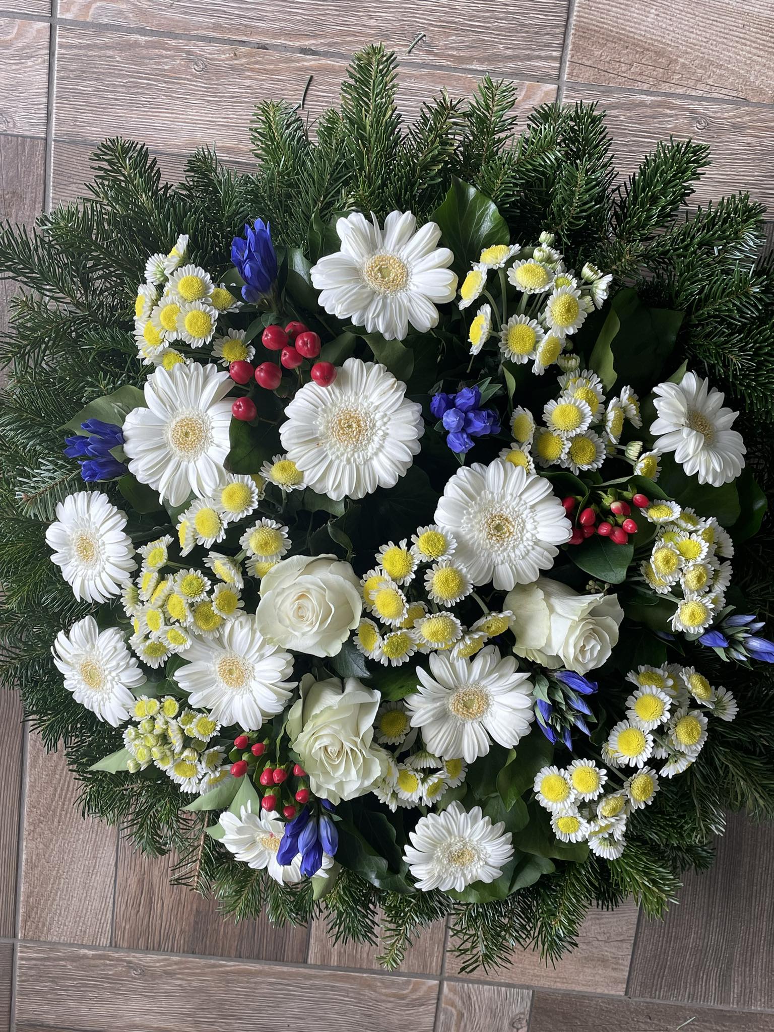 Ez a koszorú az őszinte emlékezés és tisztelet kifejezése. A fehér gerbera és krizantém a tiszta szeretetet és tiszteletet jelképezik, míg a piros bogyók a melegséget és az élet folytonosságát idézik. A fehér rózsa pedig az örök szépséget és a szeretet örök ragyogását hordozza. A Kornistárnics pedig az emlékezés és az újjászületés jele, amely mindig velünk van. Legyen ez a koszorú egy meghitt és gyönyörű emlékezés az elhunyt életére és szeretetére.